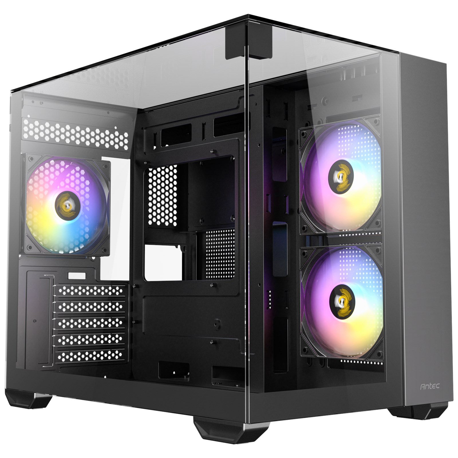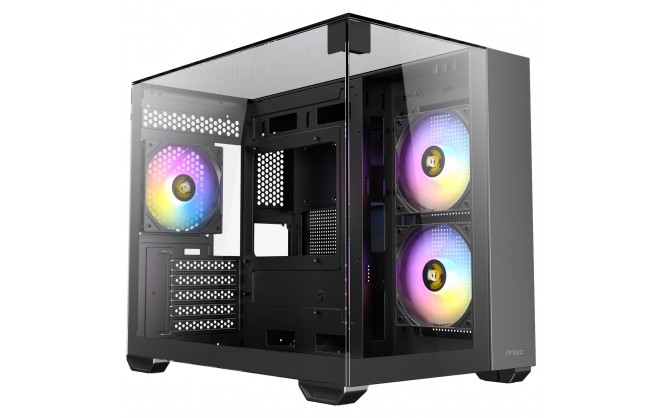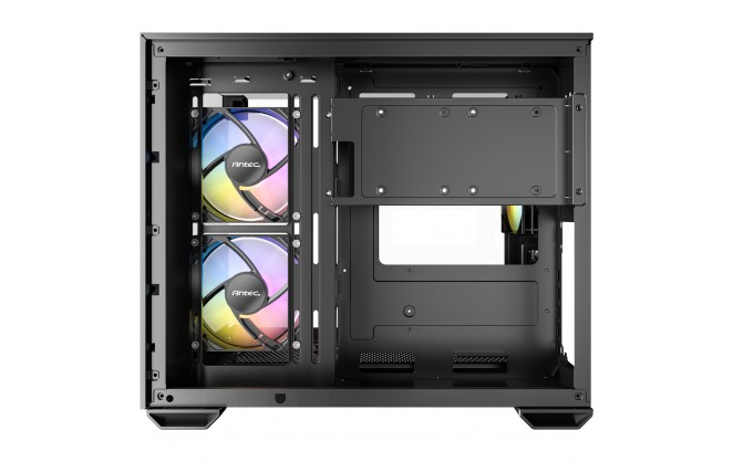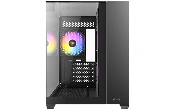 Dual chamber design ensures independent cooling for CPU/GPU on the left and PSU / Drives on the right.