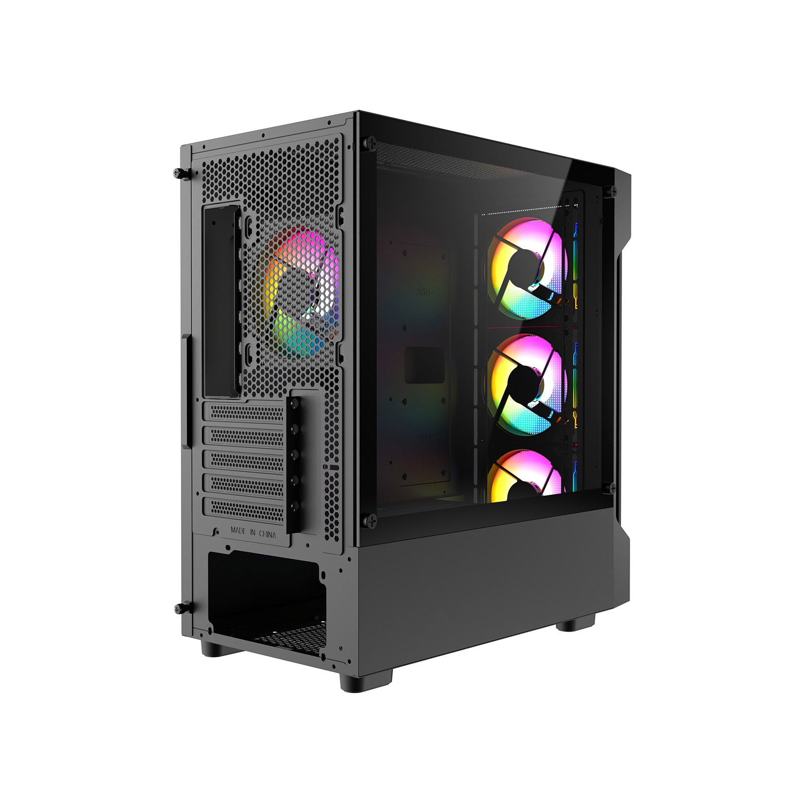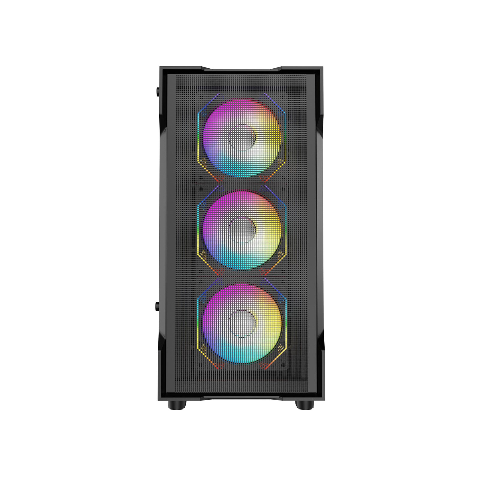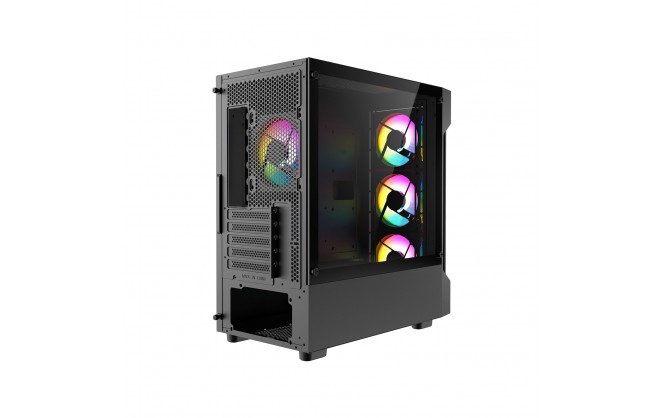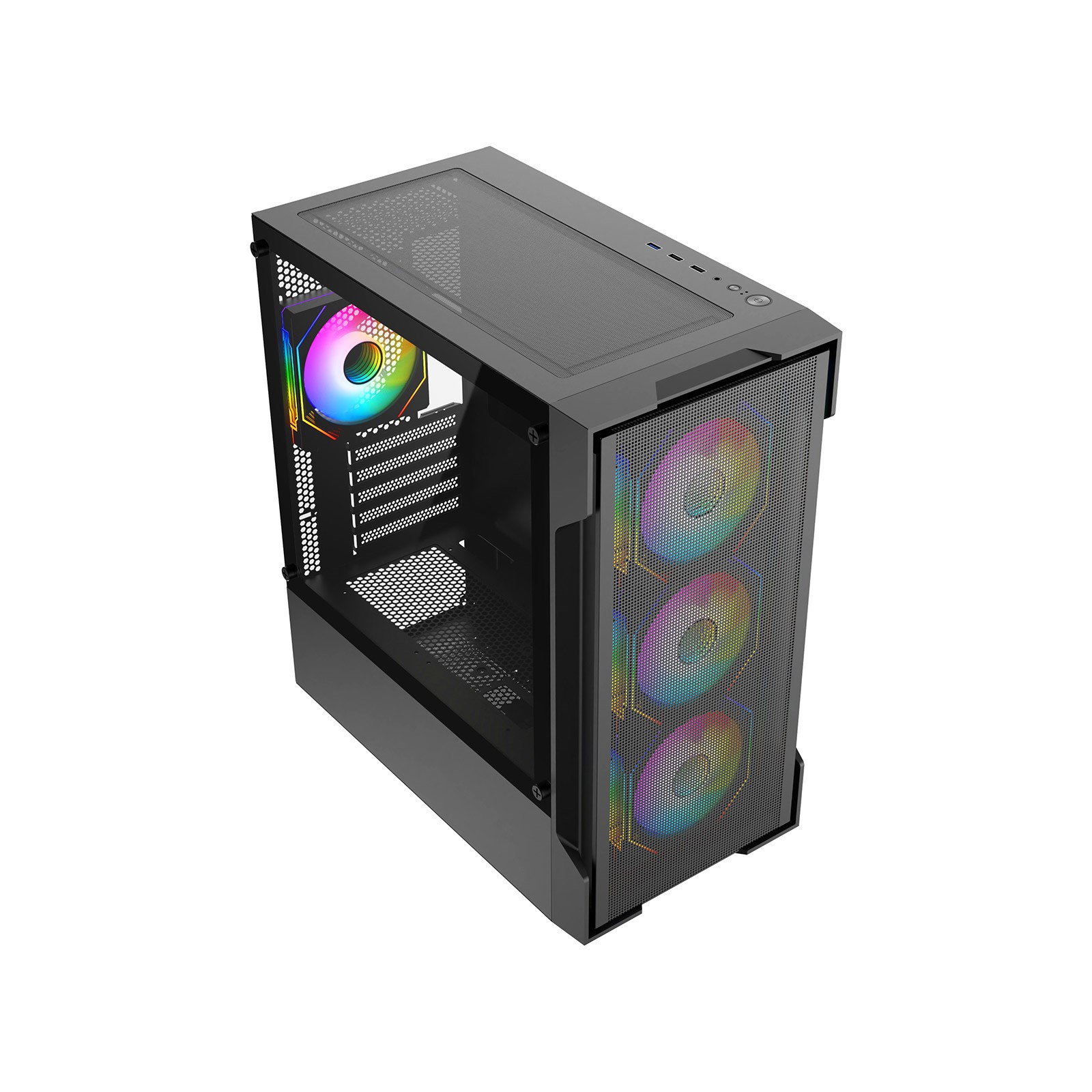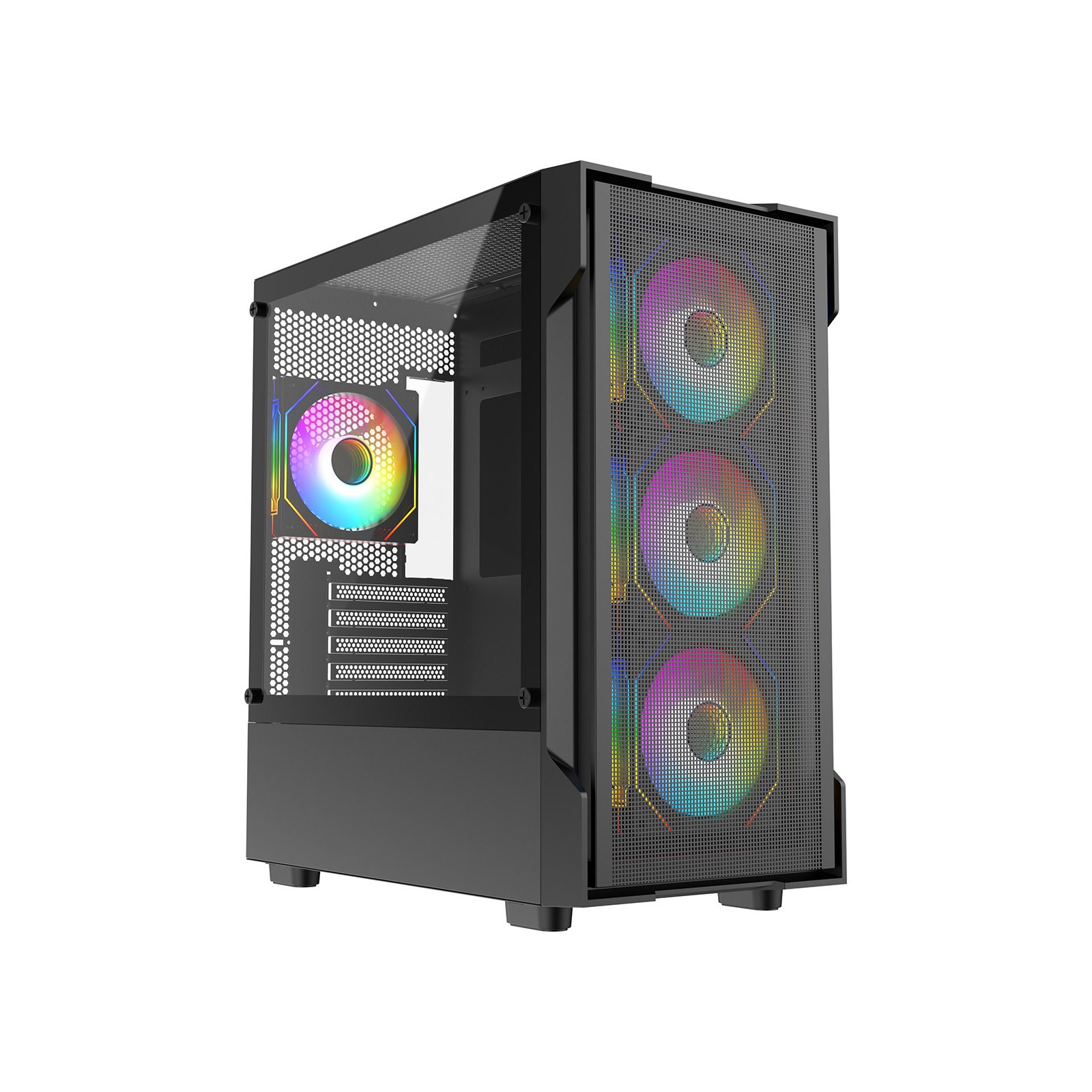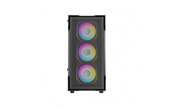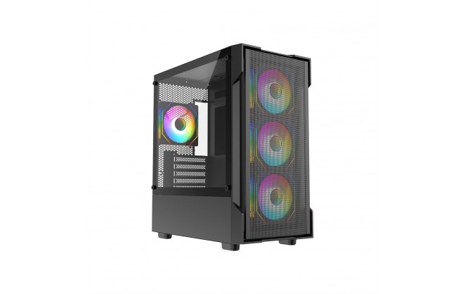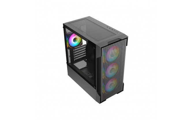 The CiT Bolt Micro-ATX black chassis is a modern and sleek Micro featuring a solid metal construction, designed with a concentrated focus on increased airflow throughout the chassis, it comes equipped with a stylish mesh front panel allows for large volumes of air to pass through unrestricted, paired with a tempered glass side panel, a premium choice for enthusiasts. Featuring a tempered glass side panel to show off the stylish four pre-installed fans beautifully illuminating the internal, the perfect blend of aesthetic and visual appeal.