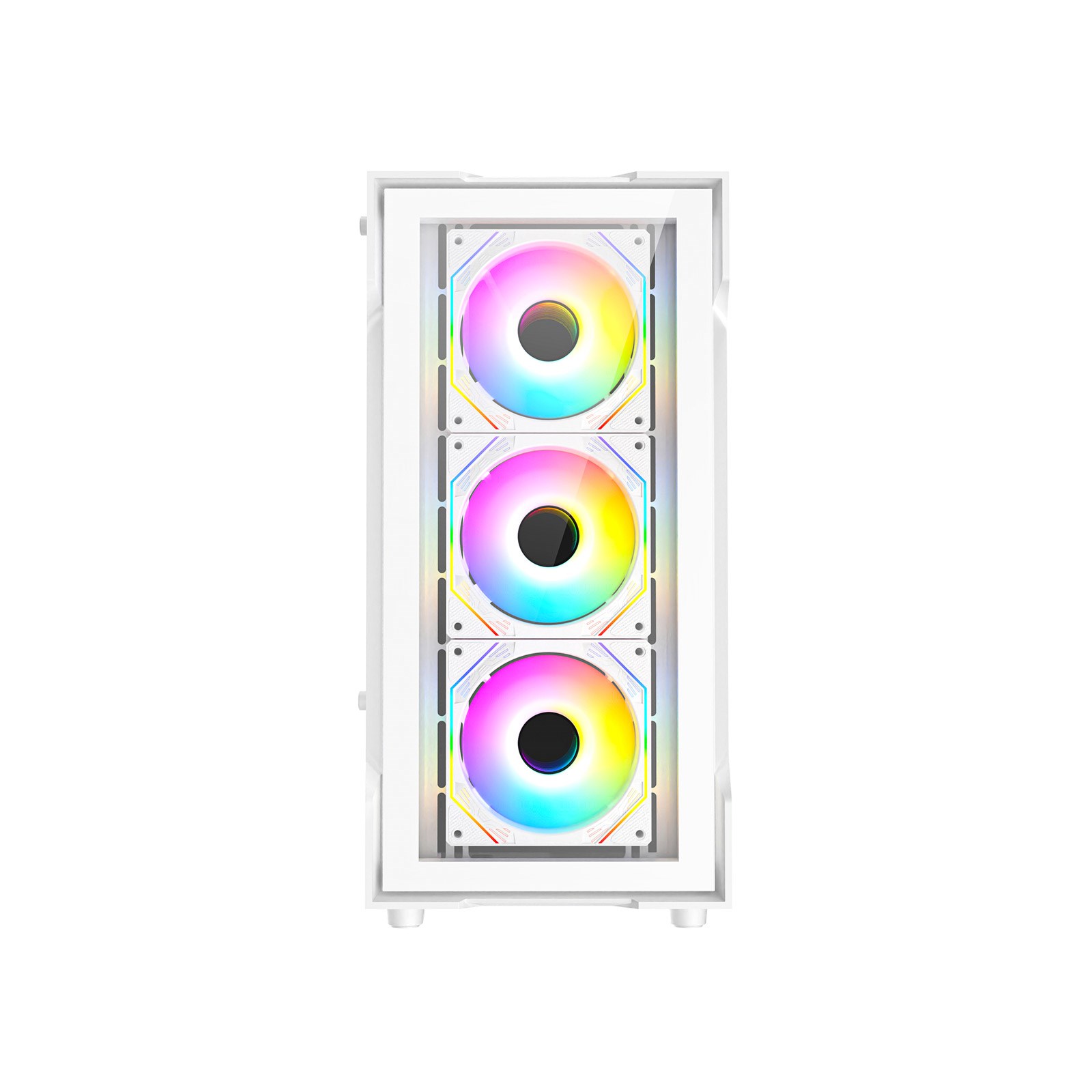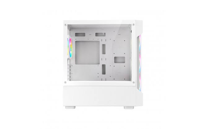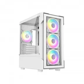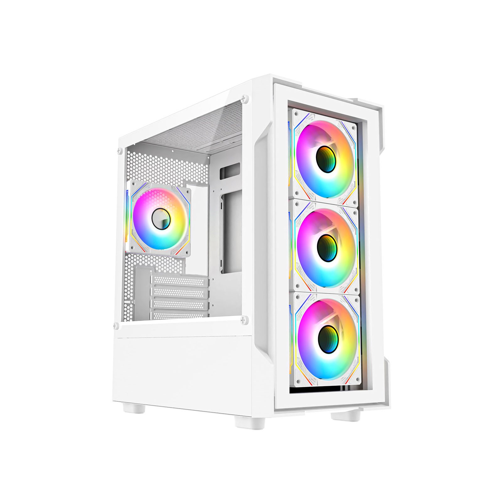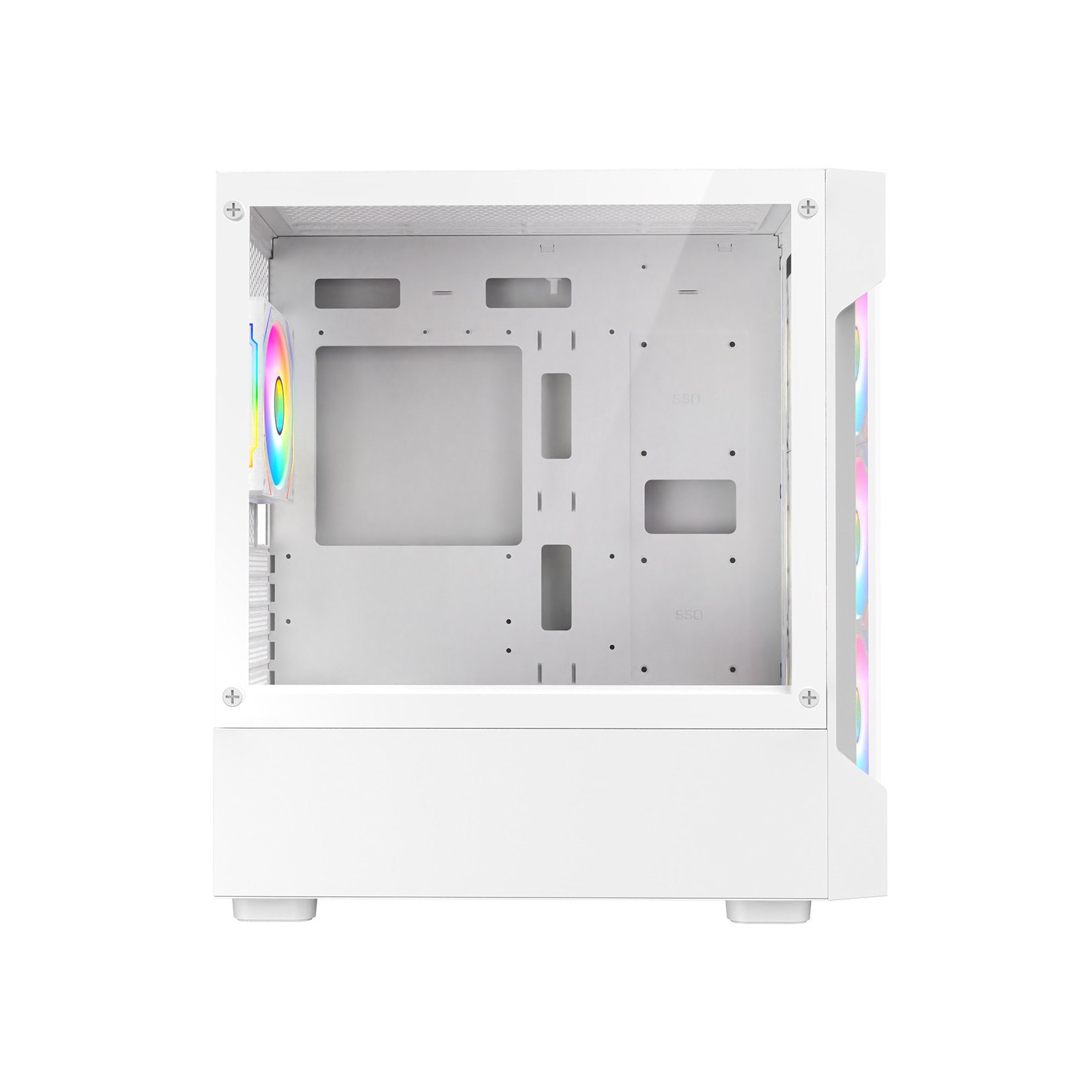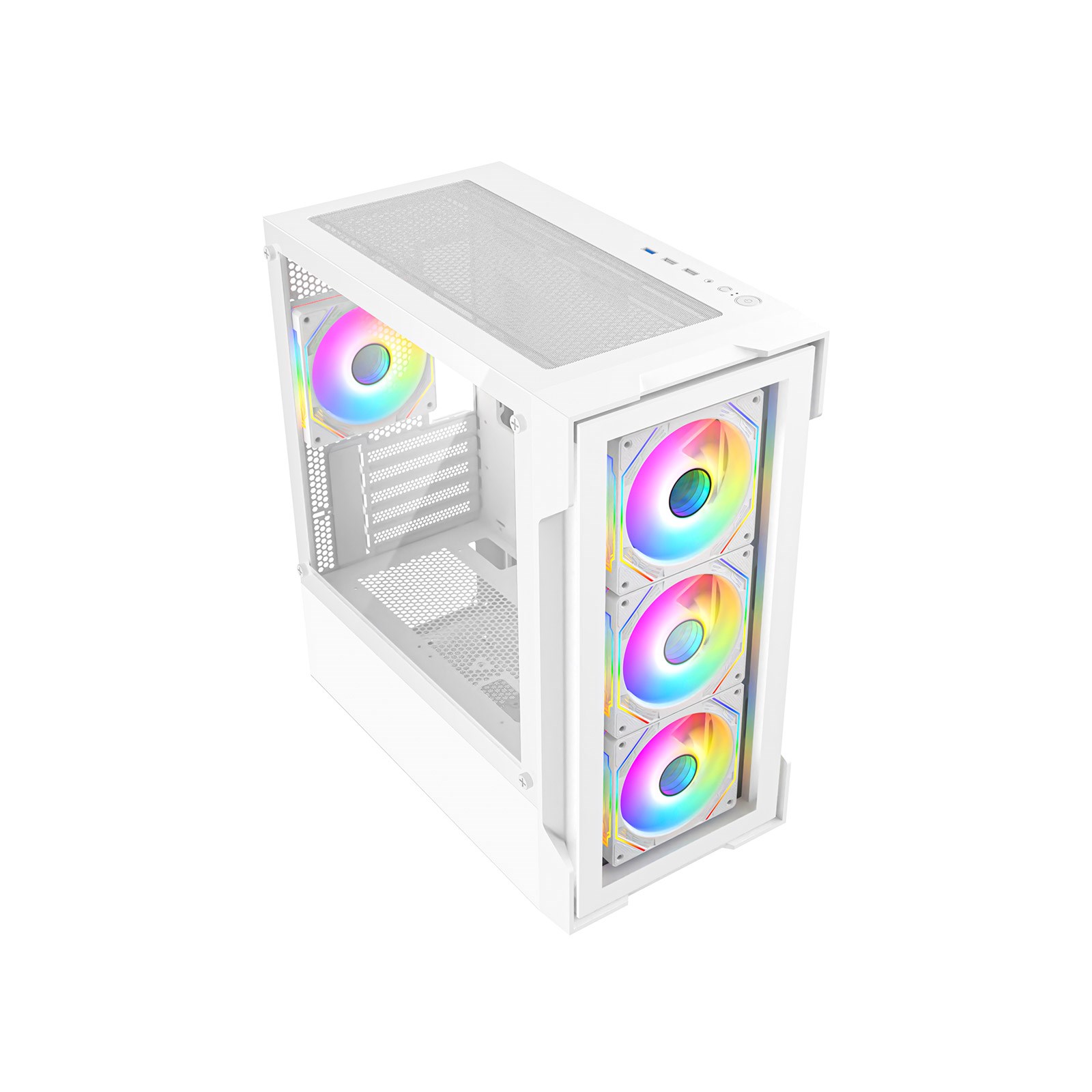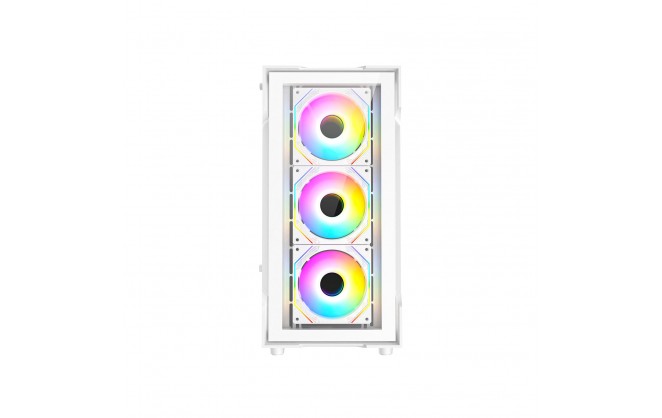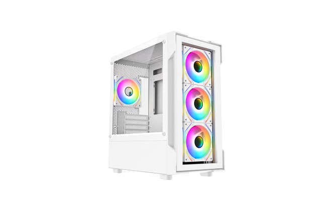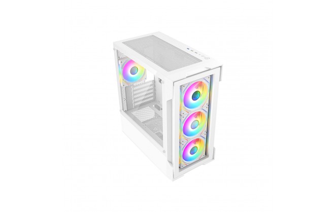 The CiT Bolt Micro-ATX white chassis is a modern and sleek Micro featuring a solid metal construction and tempered glass panels, a premium choice for enthusiasts. Featuring a tempered glass front and side panel to show off the stylish four pre-installed fans beautifully illuminating the internal, keeping your gaming PC running at optimum temperatures.