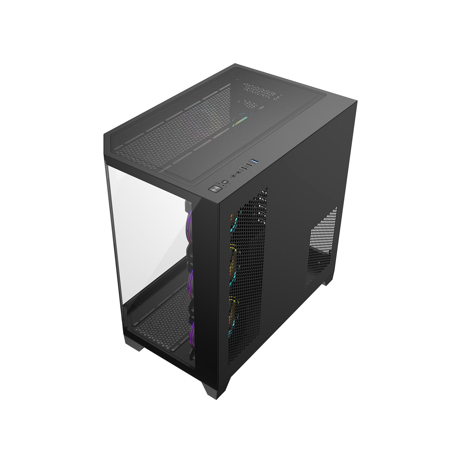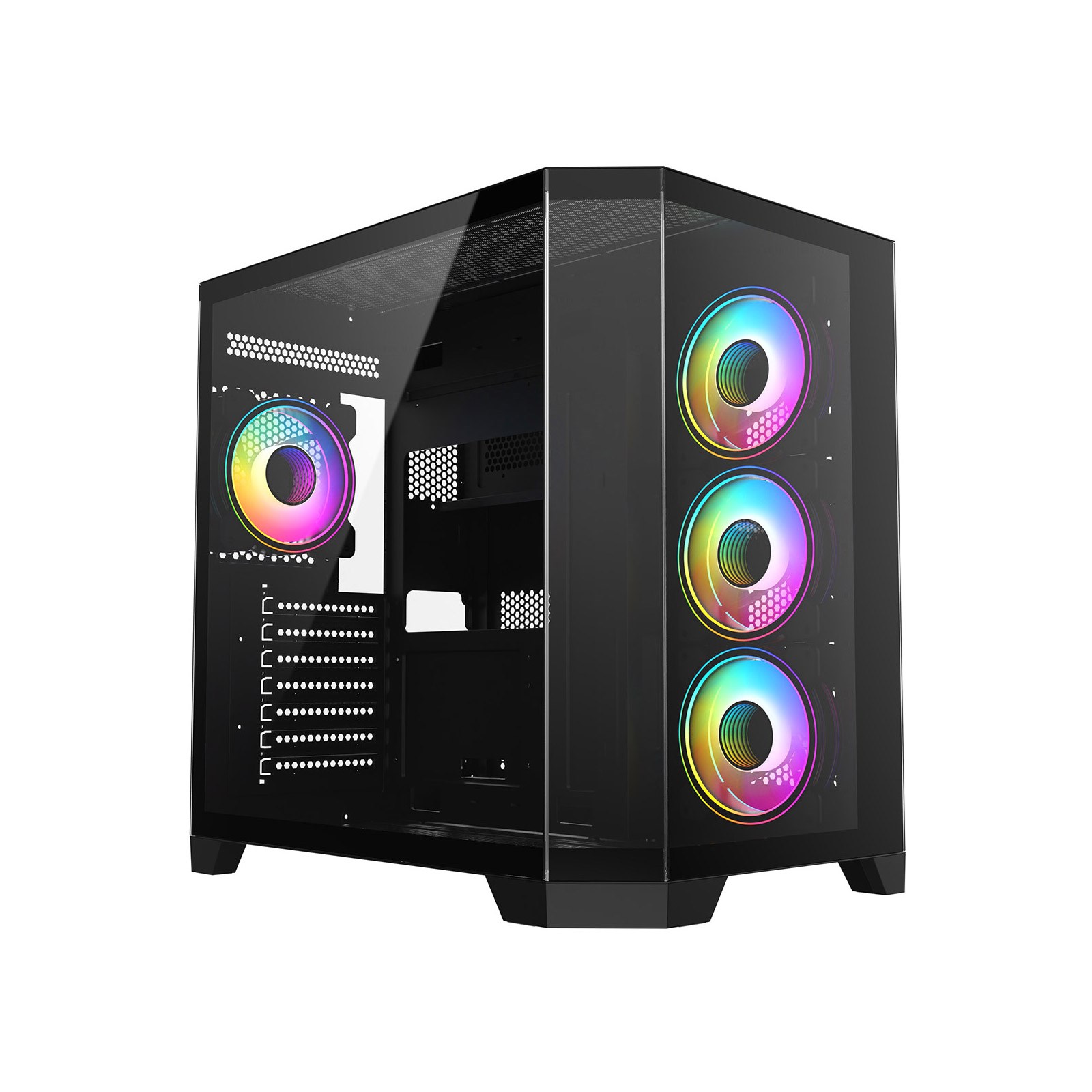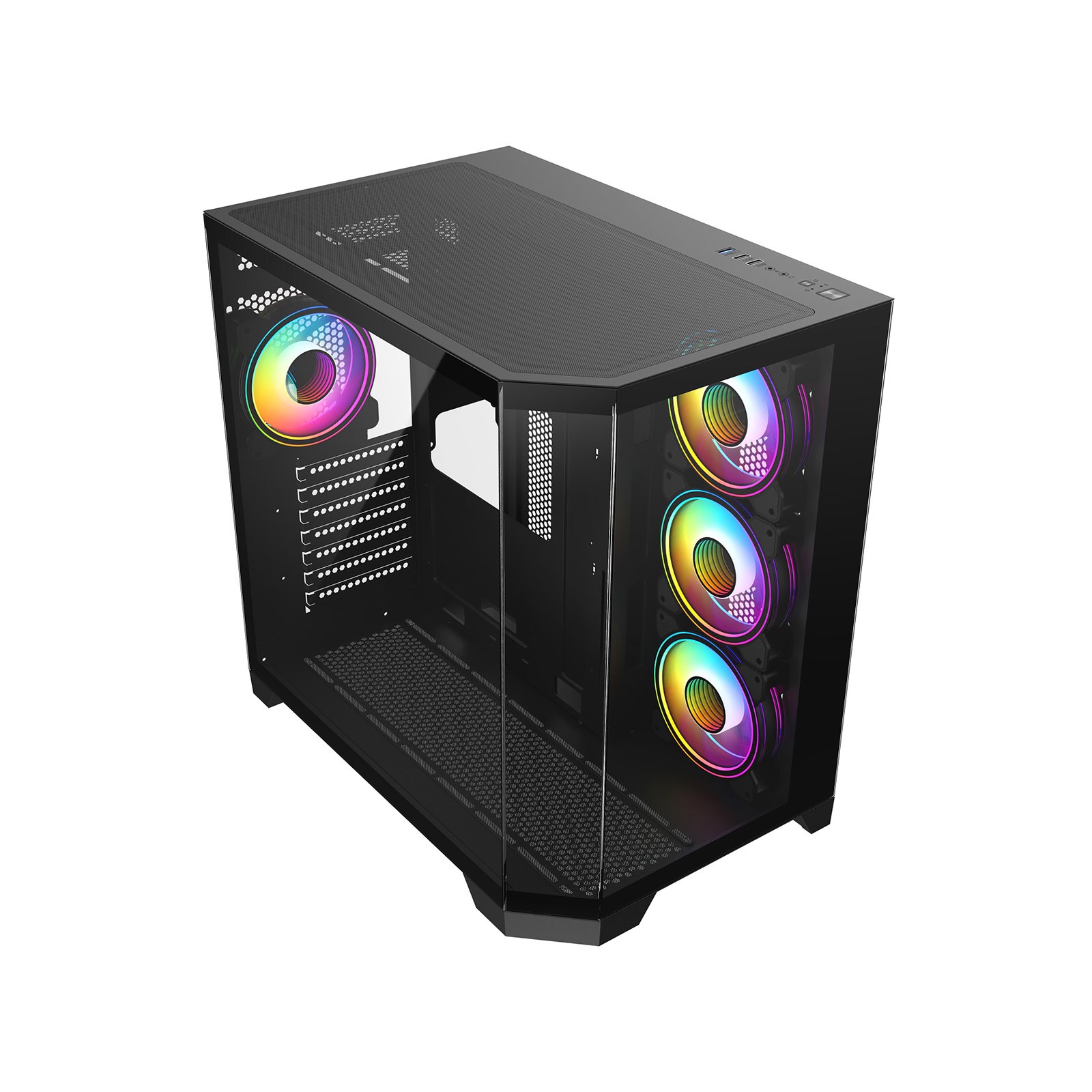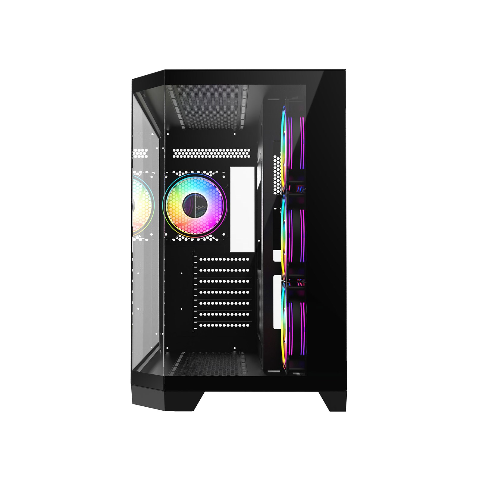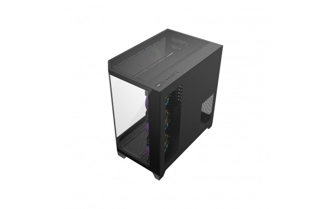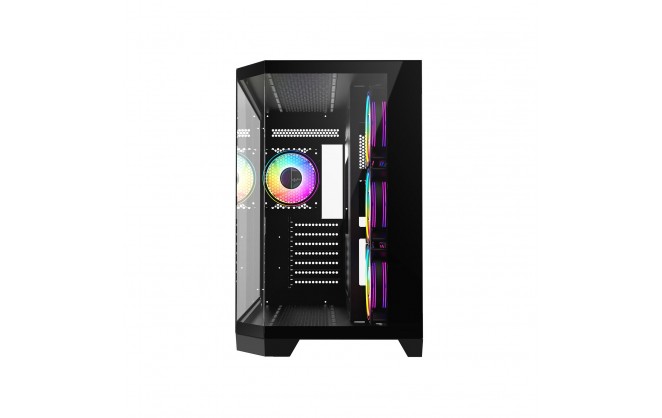• Stylish Aesthetic - The CiT DS360 finished in all black and features a cleaver design innovation with a 3-piece panoramic tempered glass design with two flat pieces and 1 angled piece of tempered glass, this unique design captures the attention and draws the eye of the viewer into the case. Unreal display potential the DS360 offers an uninterrupted view of all your gaming hardware.