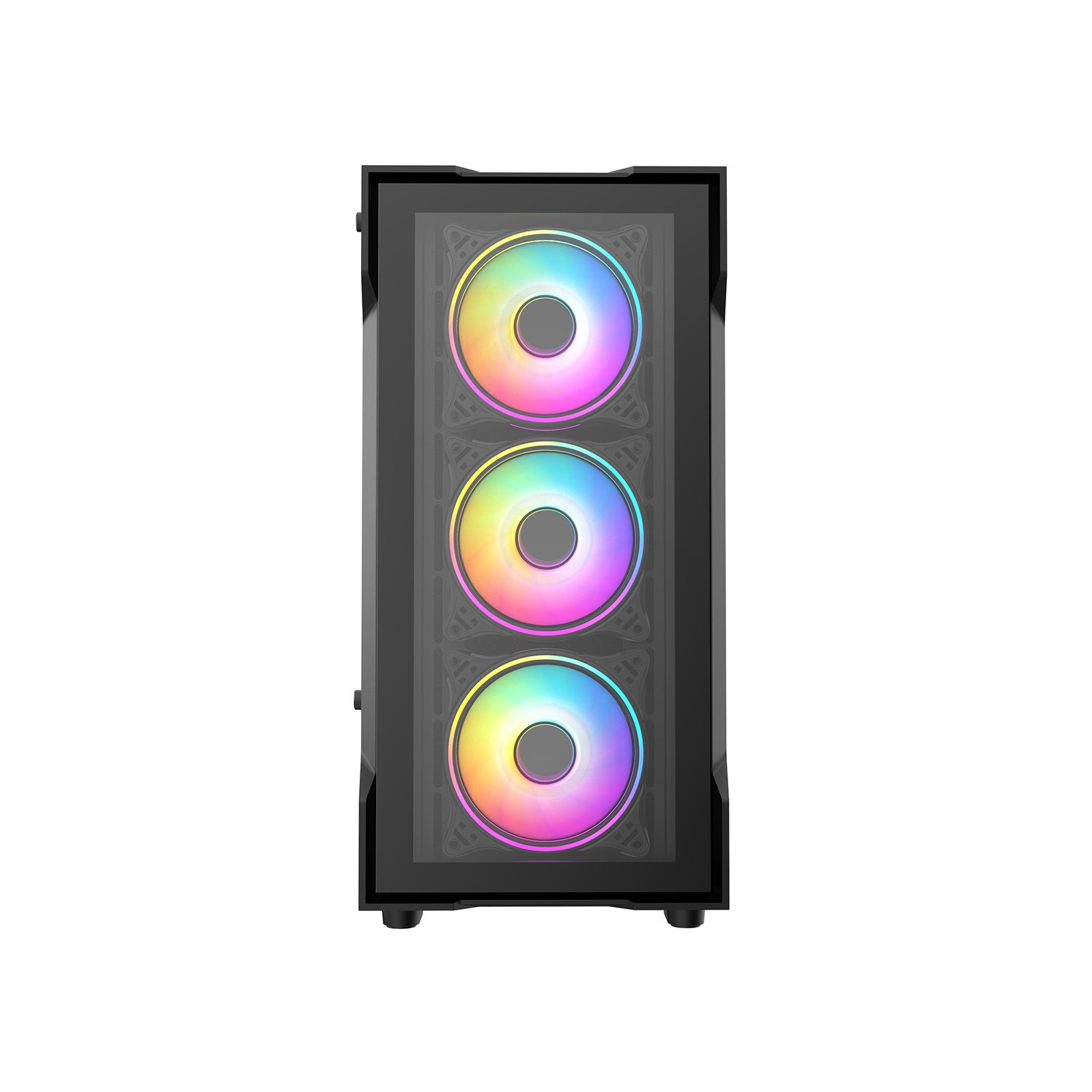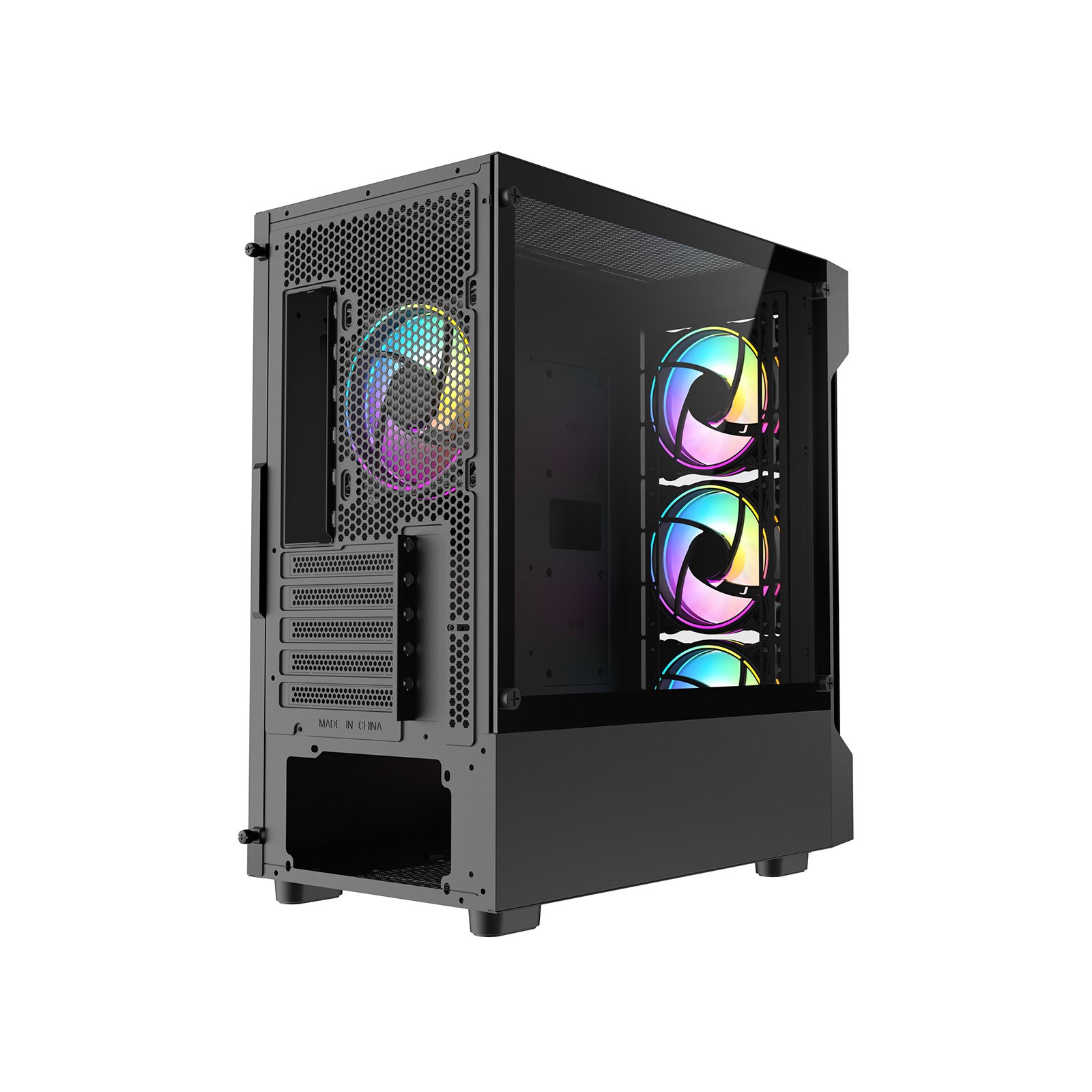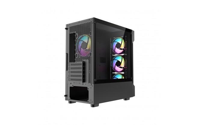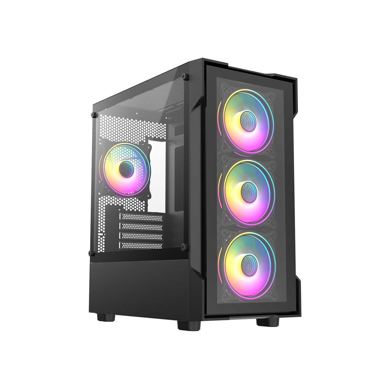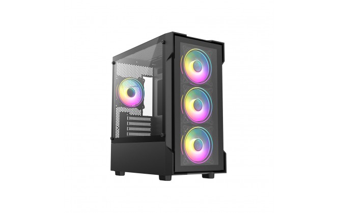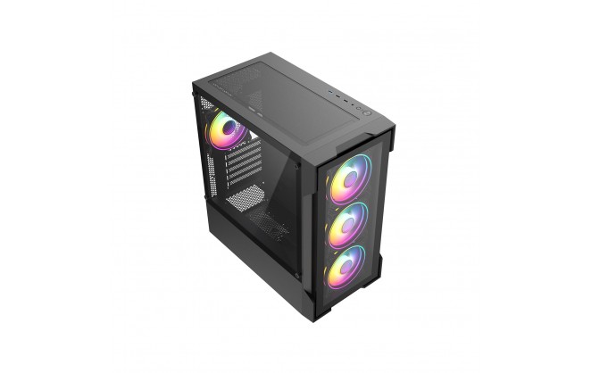 The CiT Tornado Micro-ATX black chassis is a modern and sleek Micro featuring a solid metal construction and tempered glass panels, a premium choice for enthusiasts. Featuring a tempered glass front and side panel to show off the stylish four pre-installed fans beautifully illuminating the internal, keeping your gaming PC running at optimum temperatures.