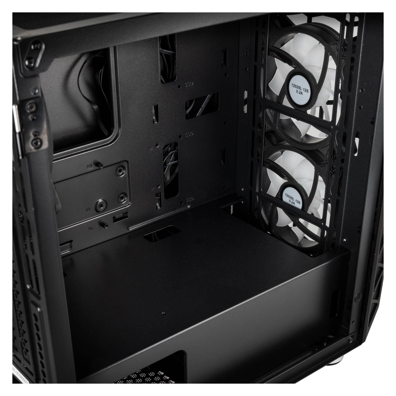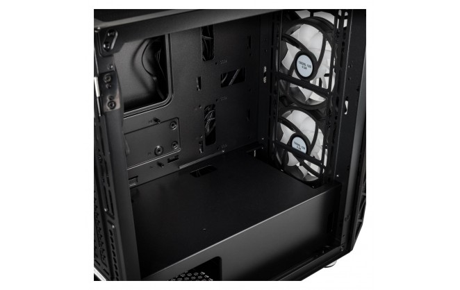 The interior comes entirely in black, with a PSU shroud that only adds to the sleek and unobtrusive look. Behind the shroud is where users will find space for a pair of 3.5" HDDs in the HDD cage provided. Alternatively, 2.5" SSDs can be installed here, or next to the motherboard. The motherboard tray and PSU shroud both offer numerous openings for optimum cable management, with up to 24mm cable management space. Underneath the case is a removable dust filter suitable for an ATX PSU up to 200mm.