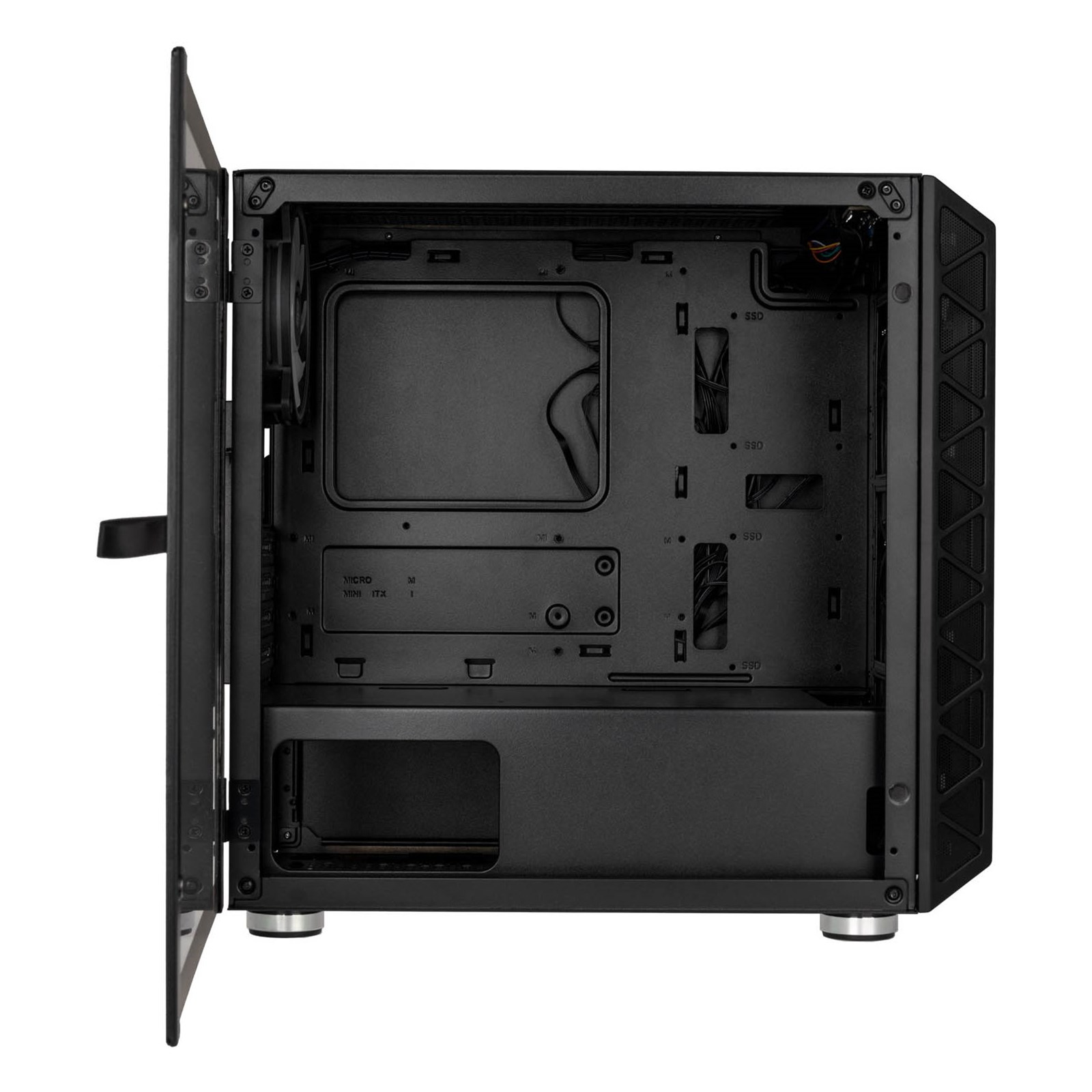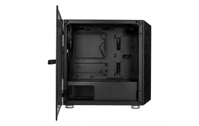 Aside from the pre-installed fans, users are also free to install two more 120/140mm fans in the roof, which is where a magnetic dust filter can be found installed on the honeycomb-style mesh. A full tempered glass hinged side panel shows off your system build, and is easily opened & closed using the pull tab. Magnets are used to keep the side panel in place when shut.