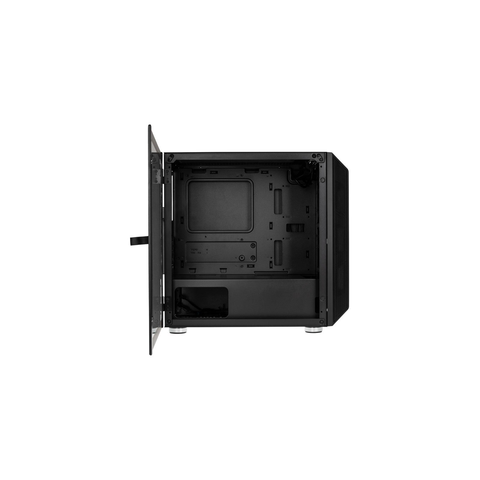 The interior comes entirely in black, with a PSU shroud that only adds to the sleek and unobtrusive look. Behind the shroud is where users will find space for a pair of 3.5" HDD's in the HDD cage provided. Alternatively, 2.5" SSD's can be installed here, or next to the motherboard. The motherboard tray and PSU shroud both offer numerous openings for optimum cable management, with up to 24mm cable management space. Underneath the case is a removable dust filter suitable for an ATX PSU up to 200mm.