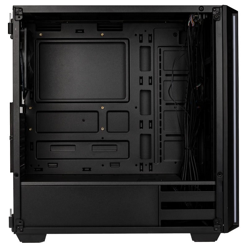 Thanks to Kolink’s clever choice of locations for the case’s cable guides and brackets, users can look forward to a strikingly smart and clean-looking case. The spacious interior can be admired from the outside thanks to the case’s use of a tempered glass side door, which of course uses hinges to make opening and closing the case a breeze. A strip of digitally addressable RGB-LEDs is attached to the side of the brushed aluminium front. A switch on the I/O panel is responsible for controlling them, along with their accompanying lighting effects. Alternatively, the strip can also be connected and controlled directly to the mainboard. Then the RGB switch on the I/O panel can also be used as a reset button. In addition to the RGB/Reset switch, there is also a USB 3.1 Type C slot, a USB 3.0 slot and two USB 2.0 ports, as well as 3.5 mm sockets for headphones and microphone, and finally a power and HDD-LED.