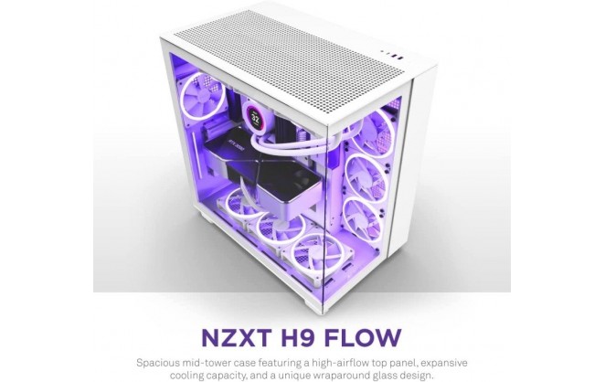 The H9 Flow is designed to cool off powerful GPUs with its expansive thermal capabilities, featuring a ten fan capacity and numerous 360mm radiator mounting options. A perforated top panel takes cooling even further, and a unique wraparound glass design with a dual-chamber layout is the perfect showcase for premium components.