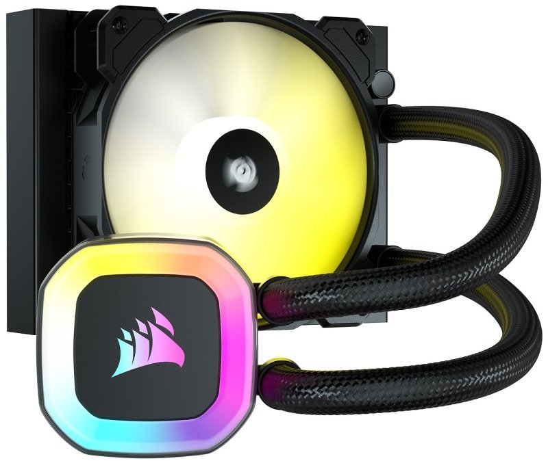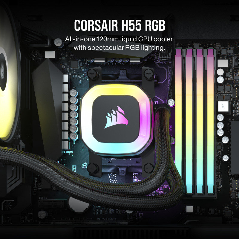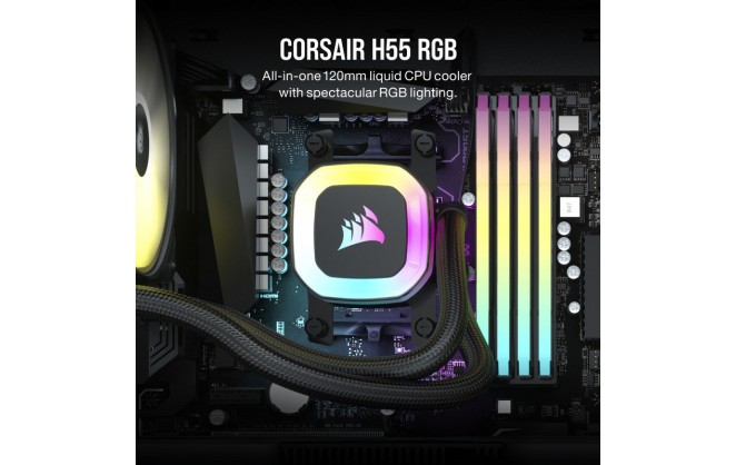 The CORSAIR H55 RGB all-in-one liquid CPU cooler delivers strong, dependable cooling and stunning RGB lighting. A high surface-area 120mm radiator dissipates heat and a CORSAIR SP120 RGB ELITE PWM fan provides superior cooling performance. Each fan boasts CORSAIR AirGuide technology to channel concentrated airflow and optimize cooling, against the colorful backdrop of eight individually addressable RGB LEDs on the fan and 13 on the pump head. Control your lighting with +5V ARGB motherboard control, or use CORSAIR iCUE software to synchronize RGB lighting (requires a CORSAIR iCUE RGB controller, sold separately). With full LGA 1200/115X/2066 and AM4 compatibility, a three-year warranty, and easy installation into almost any case, the H55 RGB makes your PC a liquid-cooled light show.