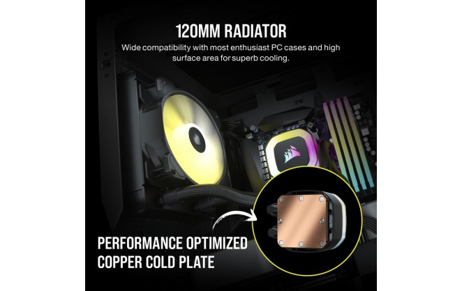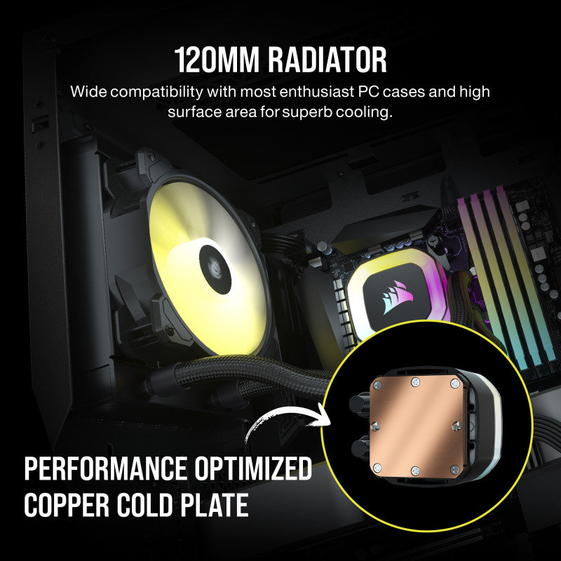 Cool CPU, with Cooler Lighting: 120mm All-in-one CPU cooling that gives your PC build dramatic color with a 120mm CORSAIR SP RGB ELITE PWM fan generating great airflow and vibrant RGB lighting.