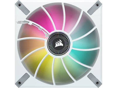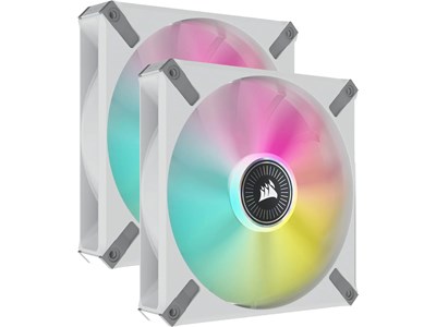 The CORSAIR iCUE ML140 RGB ELITE Premium 140mm PWM Magnetic Levitation Dual Fan Kit - White Frame boasts CORSAIR AirGuide technology with anti-vortex vanes for channeled, concentrated cooling, and magnetic levitation bearings for low noise and high performance. Eight individually addressable RGB LEDs per fan create captivating lighting effects for a cool and colorful build. The included iCUE Lighting Node CORE RGB Lighting Controller controls lighting for up to six CORSAIR RGB fans, and powerful CORSAIR iCUE software customizes vivid lighting effects and synchronizes with other iCUE-compatible devices. Each translucent low-noise fan blade runs at speeds from 400 RPM up to 1,600 RPM with zero RPM mode support, pushing up to 82.9 CFM of air for both cooling and lighting performance without compromise.
