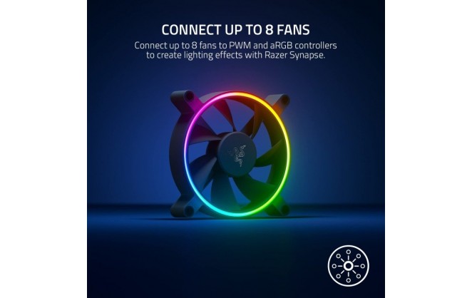 Daisy chain and connect up to 8 Razer Kunai fans to Pulse Width Modulation and aRGB controllers to create immersive lighting effects. Supported by Razer Synapse software for ultimate customization.
