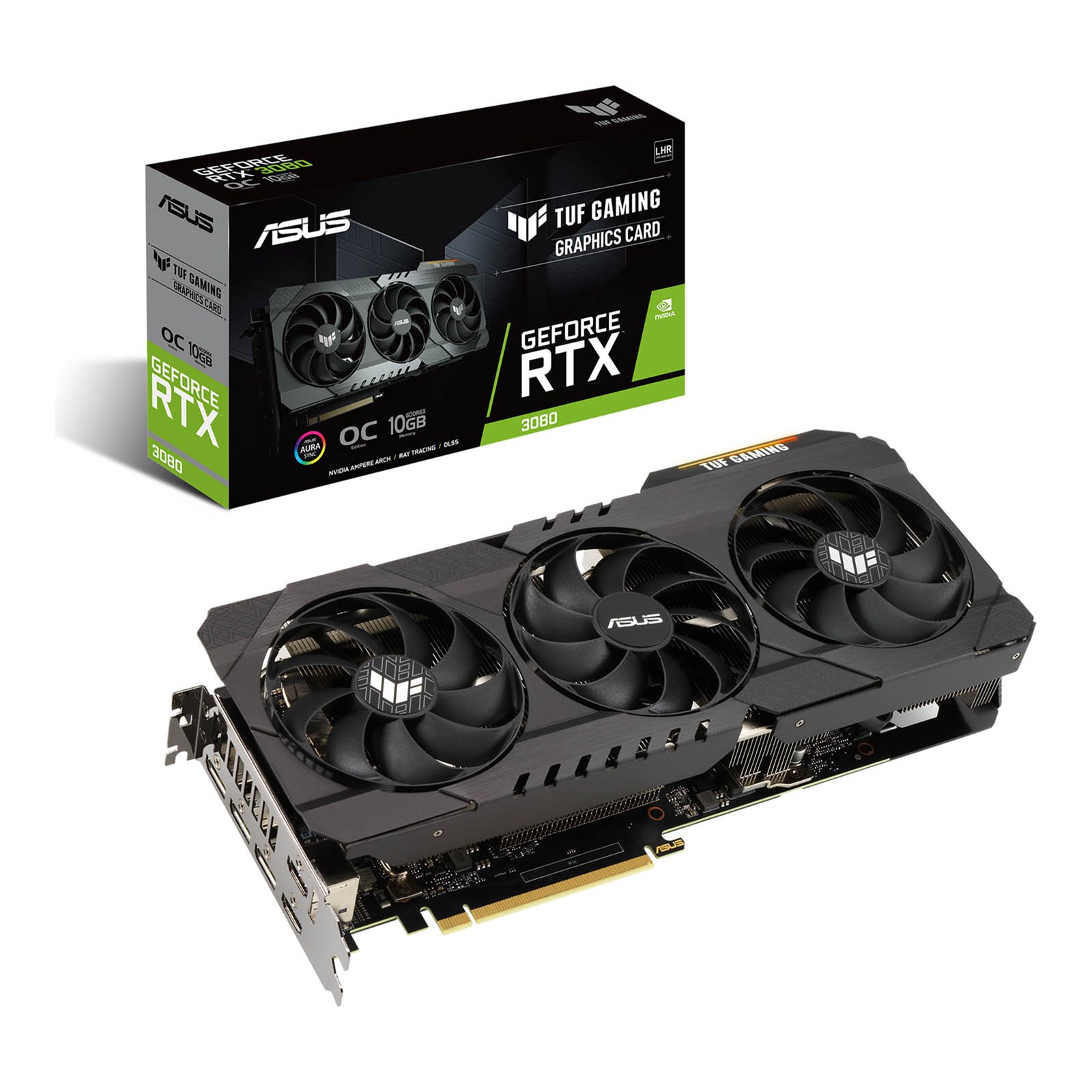 The TUF Gaming GeForce RTX™ 3080 has been stripped down and built back up to provide more robust power and cooling. A new all-metal shroud houses three powerful axial-tech fans that utilise durable dual ball fan bearings. Fan rotation has been optimised for reduced turbulence, and a stop mode brings all three fans to a halt at low temps. Beneath, independent heatsinks for the GPU and memory keep thermals under tight control. Additional features, including TUF components, Auto-Extreme Technology, a new GPU bracket, and a backplate vent make the TUF a proper powerhouse. For builders looking for a new “old faithful”, this card has your back.