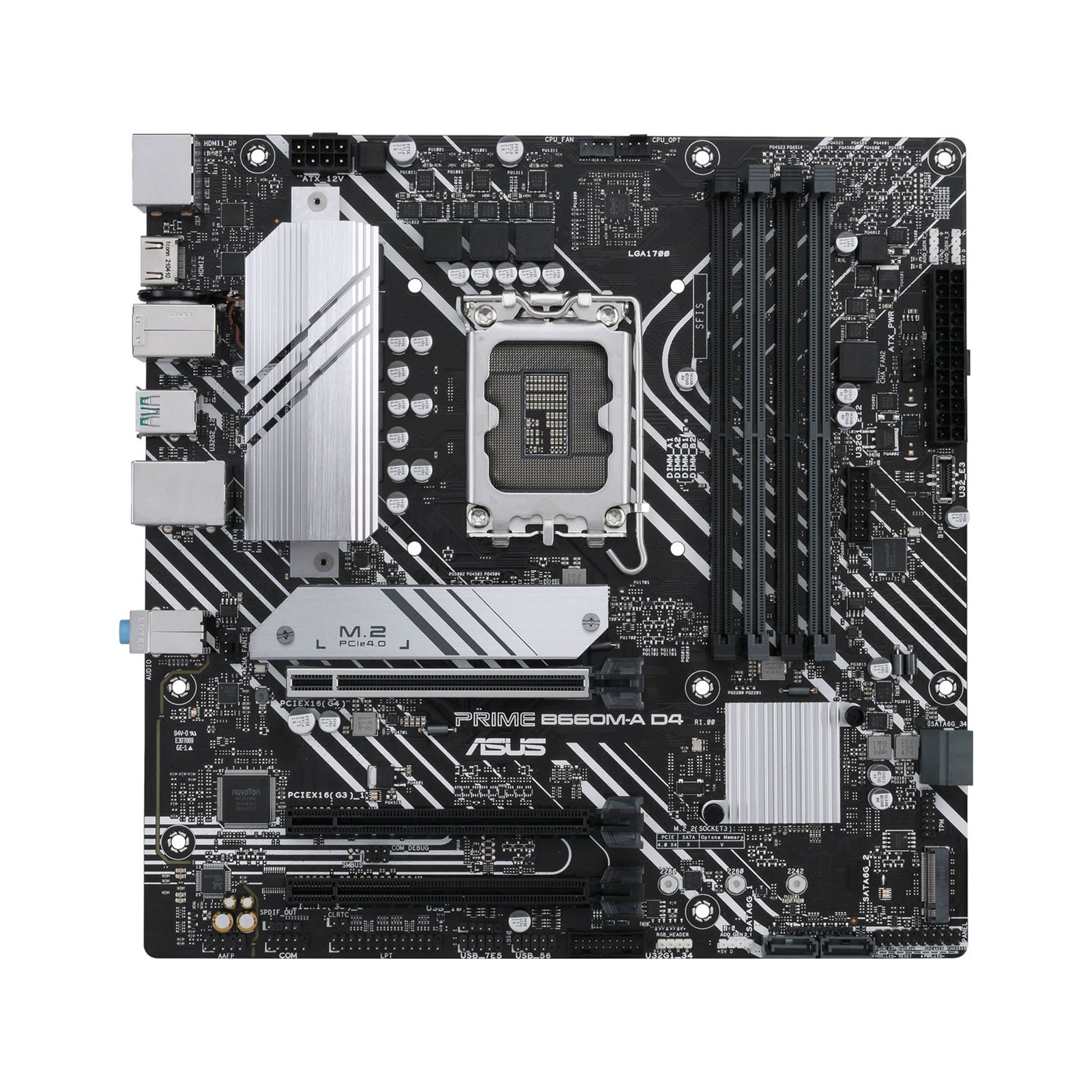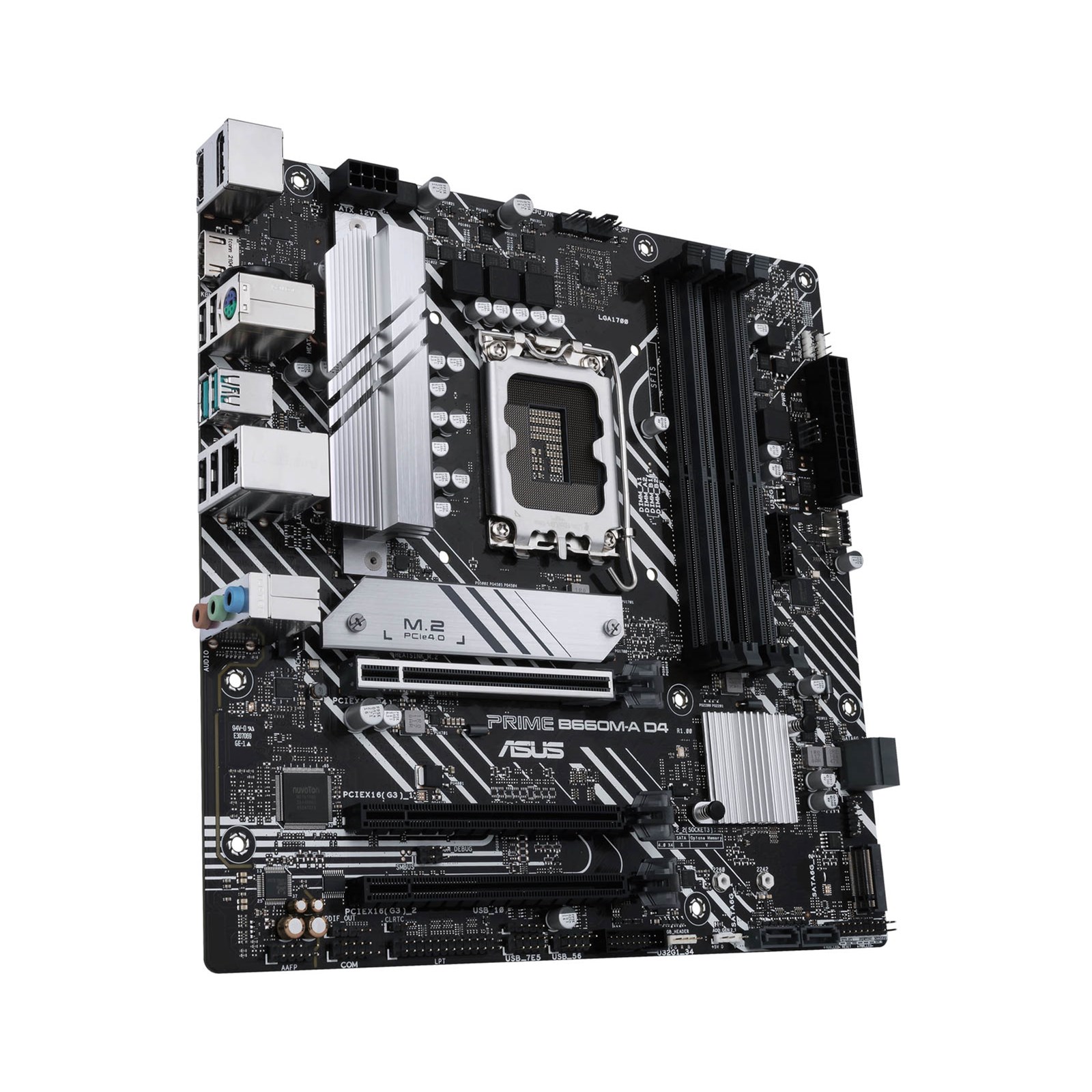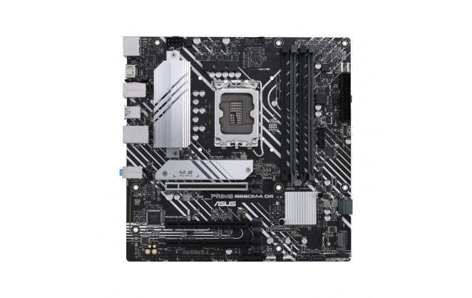 ASUS PRIME B660M-A D4 offers a sleek, futuristic-looking build with a black and white finish, space-shuttle-inspired design elements, metallic nameplate and PCB cover.