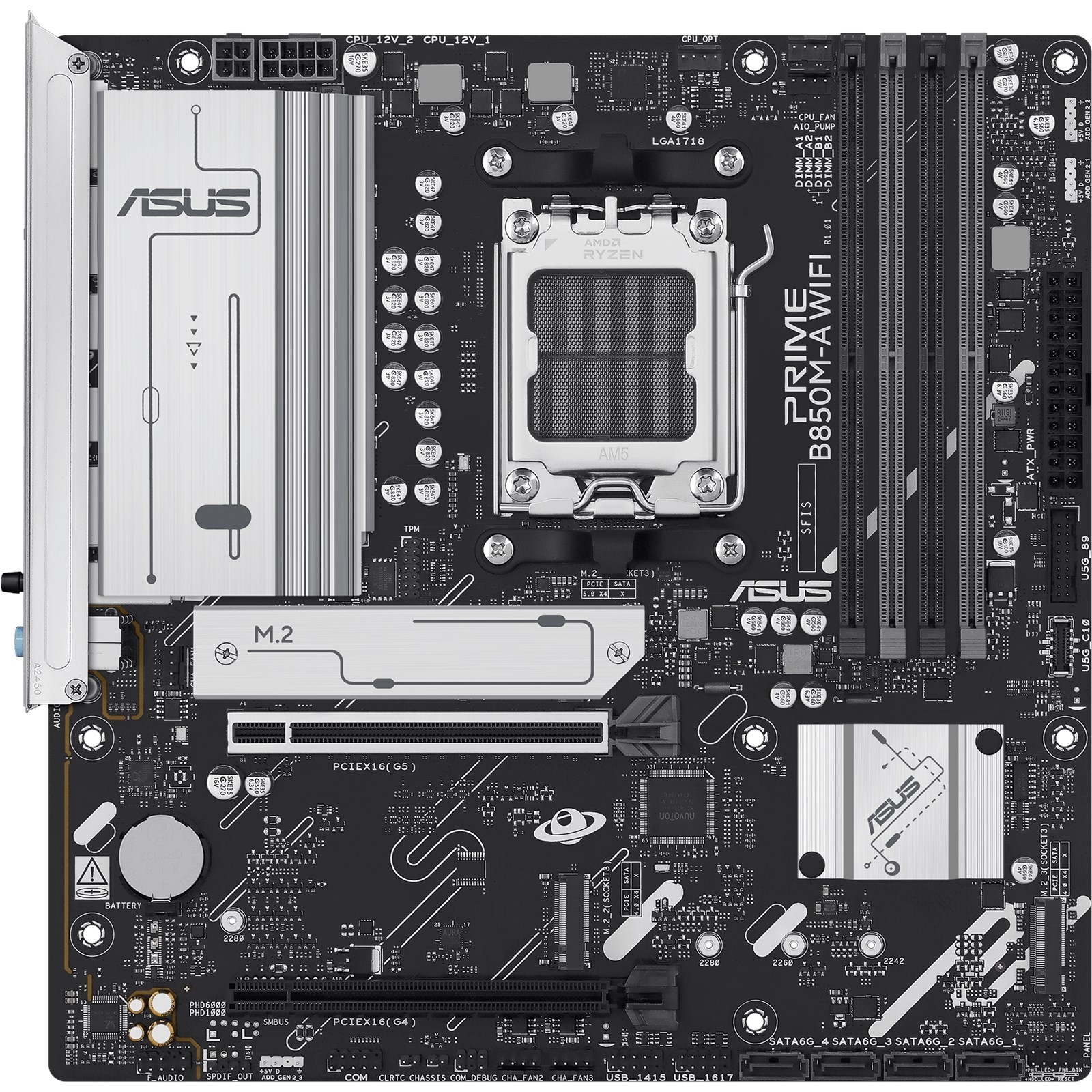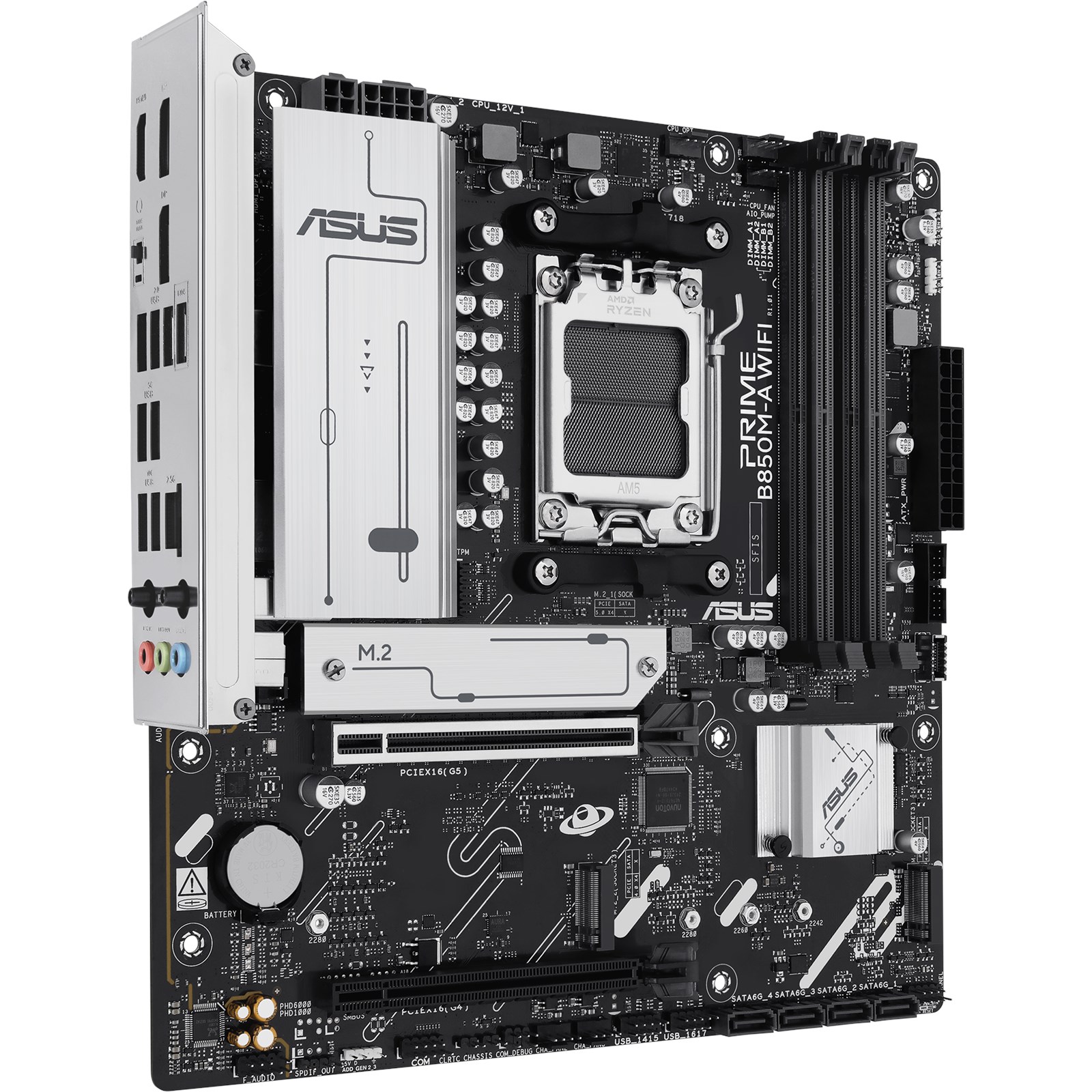 PRIME B850M-A WIFI offers a total of three M.2 slots, including one that supports data-transfer speeds of up to 128 Gbps via PCIe 5.0, and two that support PCIe 4.0. This enables quicker boot-up and app load times with OS or application drives.