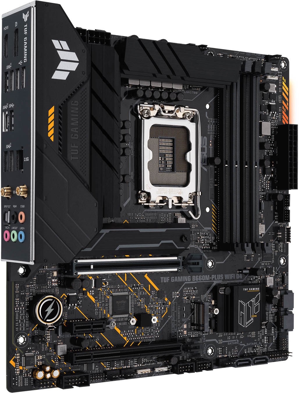 ASUS TUF GAMING B660M-PLUS WIFI D4 takes all the essential elements of the latest Intel® processors and combines them with game-ready features and proven durability. Engineered with military-grade components, an upgraded power solution and a comprehensive cooling system, this motherboard offers rock-solid and stable performance for marathon gaming. Aesthetically, TUF GAMING B660M-PLUS WIFI D4 sports the new TUF Gaming logo and incorporates simple geometric design elements to reflect the dependability and stability that defines the TUF Gaming series.
