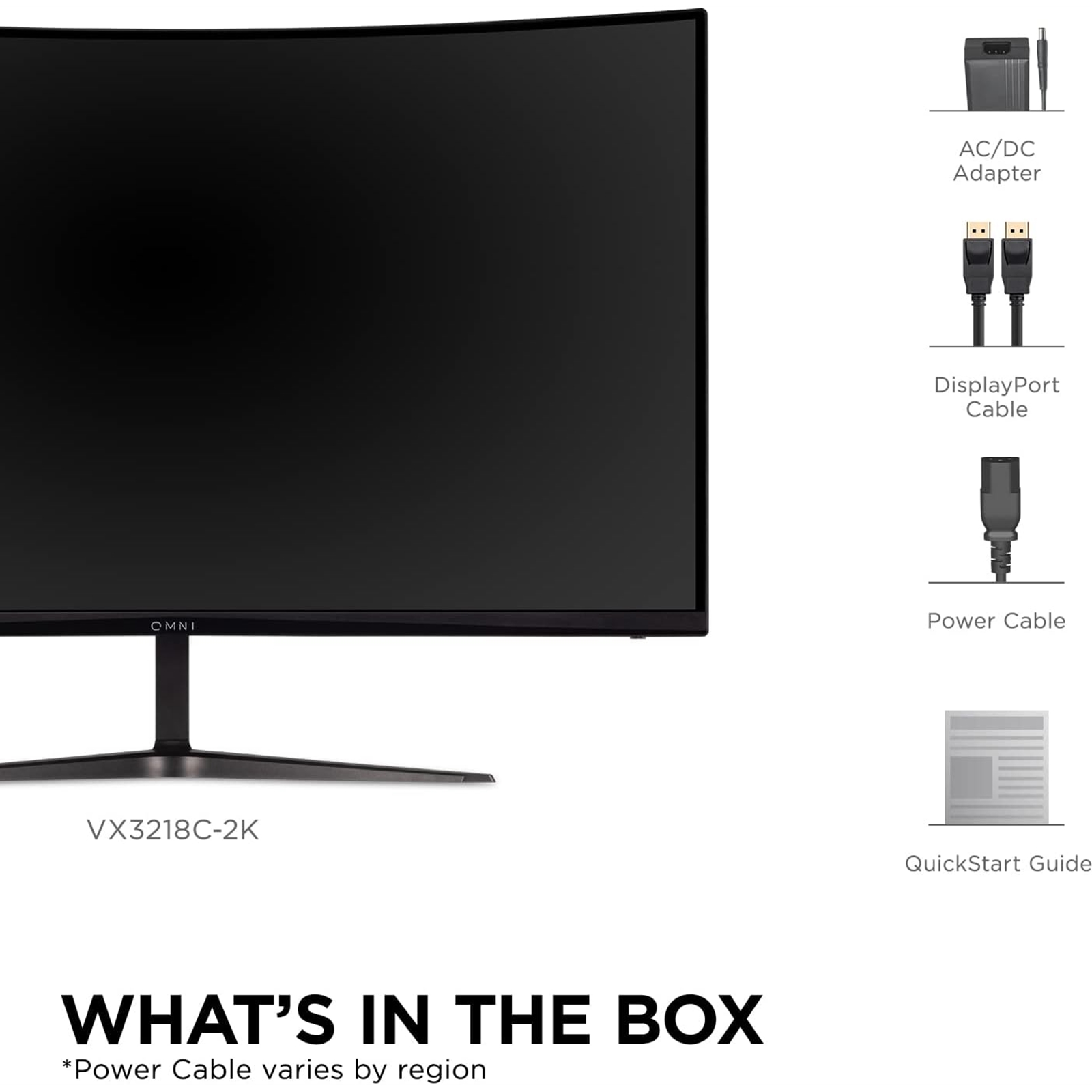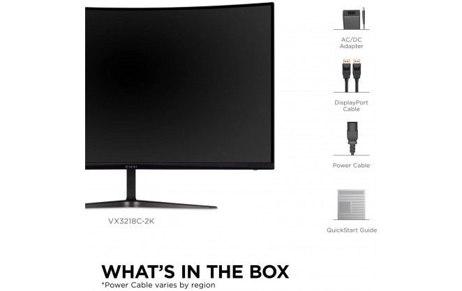 VX3218C-2K x1, 3-pin Plug (IEC C13 / CEE22) x1, DisplayPort Cable (v1.2; Male-Male) x1, AC/DC Adapter x1, Quick Start Guide x1