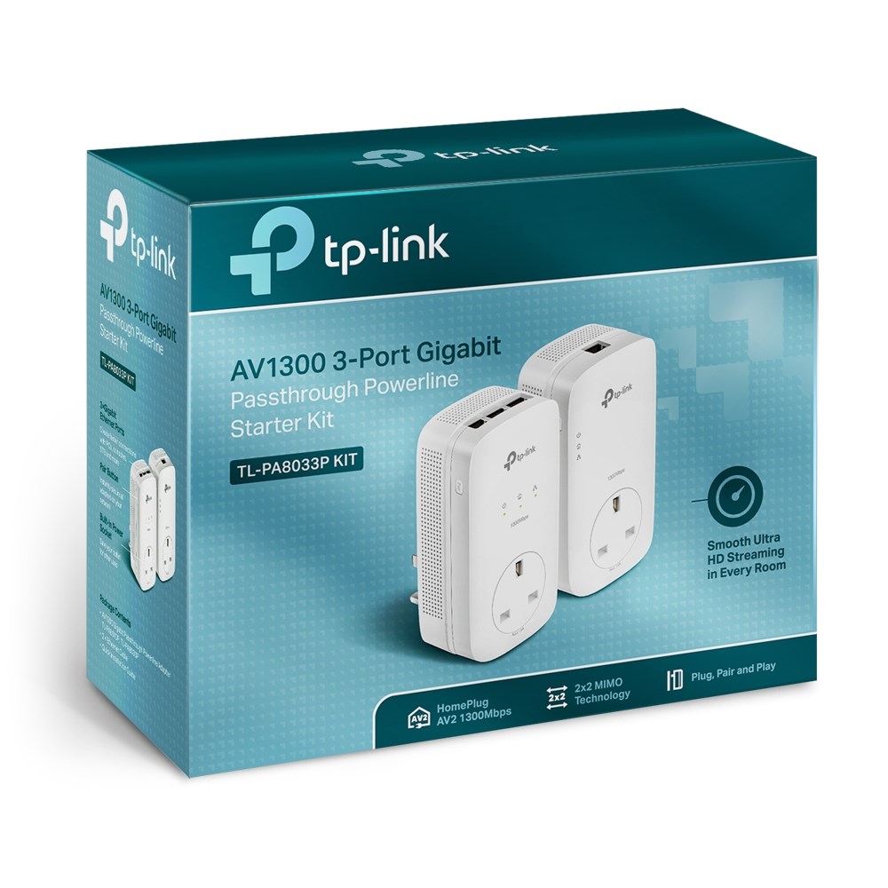 MIMO Technology with Beamforming maximizes the performance on the independent streams, which improves coverage throughout the home, particularly for previously hard to reach outlets. MIMO Technology means the TL-PA8033P KIT can use the 3 wires, including the live, neutral and earth to create multiple data paths, meaning that you benefit from faster data throughput and more stable connections. With 3 gigabit Ethernet ports, TL-PA8033P KIT can simultaneously connect up to 3 wired-only devices. This makes the TL-PA8033P KIT the perfect home entertainment companion. Connect any 3 devices from smart TVs and game consoles to NAS boxes and computers to the Internet at the same time. Just plug the Ethernet cable into the powerline and away you go. Connect a powerline adapter to the router; plug another powerline adapter into a wall socket in another room, and connect it to your Internet enabled device via Ethernet - and you're done. The integrated power socket, with power output of up to 13A*, means the powerline can be used like a traditional electrical socket. Simply plug in your device or extension lead as though it were a normal wall socket. The built-in noise filter also helps to prevent electrical signal noise from affecting Powerline performance. TL-PA8033P KIT is a new-generation of Powerline adapter. Its sophisticated Power-Saving mode automatically switches from its regular 'Working' mode to 'Power-Saving' mode reducing energy consumption by up to 85%.