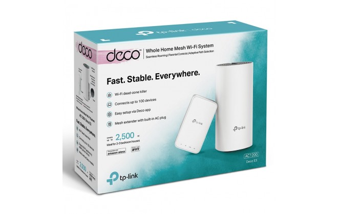 Deco E3 is a simple way to guarantee a strong Wi-Fi signal in every corner of your home up to 2,400 square feet (2-pack, EU version). 2.4 GHz and 5 GHz wireless connections work together to provide even faster network speeds and truly seamless coverage.