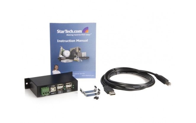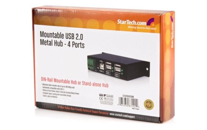 This sturdy, industrial grade USB hub can be wall mounted or installed onto a DIN rail for convenient access to its 4 female USB ports, providing a work area, server room, or industrial area with USB 2.0 connectivity.